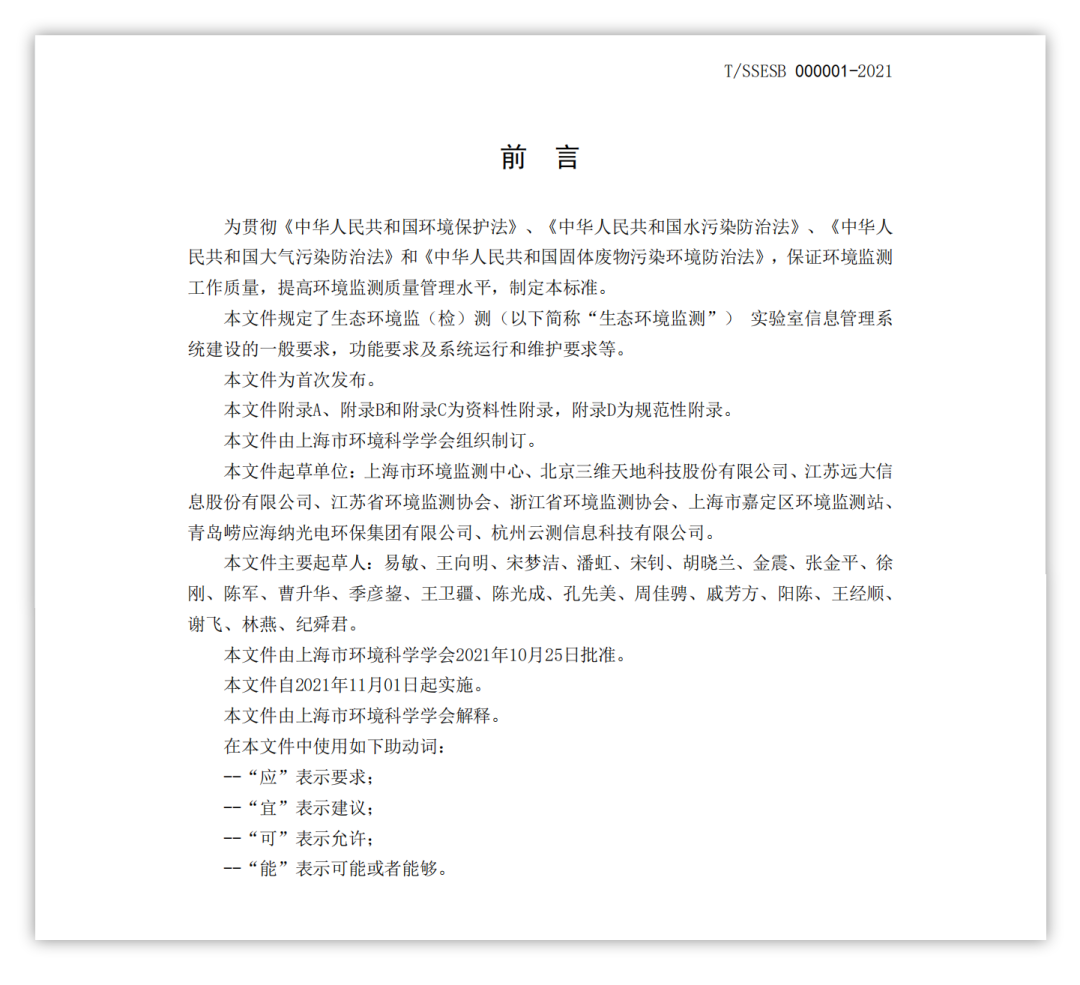 10月25日,由上海市環(huán)境監(jiān)測中心、北京三維天地科技股份有限公司及江蘇、浙江省環(huán)境監(jiān)測協(xié)會等八家單位共同起草的《生態(tài)環(huán)境監(jiān)測實驗室信息管理系統(tǒng)建設(shè)技術(shù)指南》,經(jīng)上海市環(huán)境科學(xué)學(xué)會批準,將于2021年11月01日起正式實施。