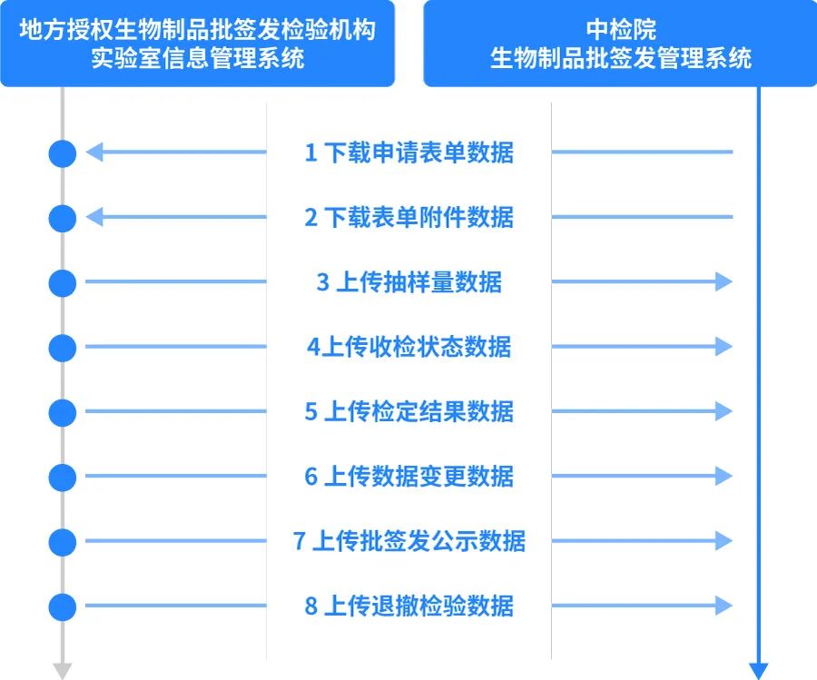 系統(tǒng)支持與中檢院生物制品批簽發(fā)管理系統(tǒng)的直接對接,實現(xiàn)疫苗批簽發(fā)申請表單數(shù)據(jù)及附件信息的自動獲取,實現(xiàn)抽樣量數(shù)據(jù)、收檢狀態(tài)數(shù)據(jù)、檢定結(jié)果數(shù)據(jù)、數(shù)據(jù)變更數(shù)據(jù)、批簽發(fā)公示數(shù)據(jù)、退撤檢數(shù)據(jù)的自動上傳,大幅度減少實驗室業(yè)務受理人員、數(shù)據(jù)上報人員對相同信息在不同系統(tǒng)中重復錄入的工作量,確保信息的完整性和一致性,提升批簽發(fā)工作效率,提升批簽發(fā)信息上報及時性。