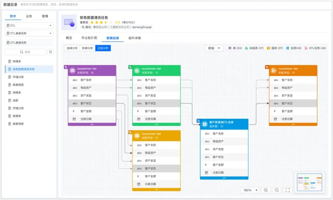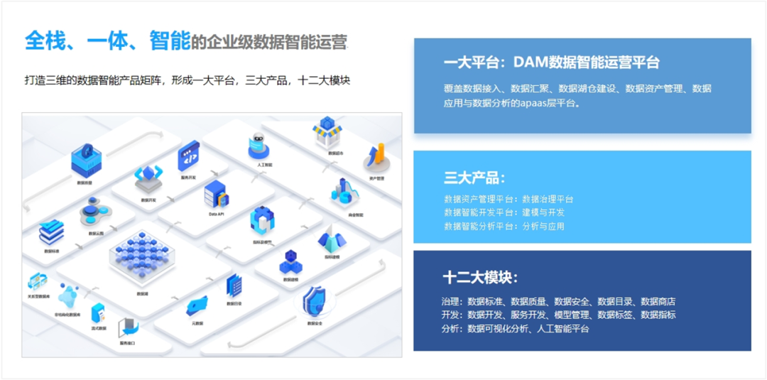 2023年10月26日,2023三維天地?cái)?shù)據(jù)資產(chǎn)高峰論壇在北京成功舉辦。期間全新一代的數(shù)據(jù)資產(chǎn)管理平臺(tái)(DAM)v13正式與廣大用戶見面。 全新版DAM V13是基于客戶需求變化而進(jìn)行的一次功能迭代。平臺(tái)吸收了100+項(xiàng)目實(shí)施過程中用戶提出的重要需求,進(jìn)行統(tǒng)一歸納分析提煉,作為階段性需求進(jìn)行新功能開發(fā),新版本將更貼合項(xiàng)目實(shí)際使用場(chǎng)景,在工具化,自動(dòng)化、智能化的方向走出堅(jiān)實(shí)的一步,以更好地表達(dá)三維天地的產(chǎn)品對(duì)于企業(yè)數(shù)字化轉(zhuǎn)型的支撐價(jià)值。 產(chǎn)品新增了數(shù)據(jù)指標(biāo)、數(shù)據(jù)建模、數(shù)據(jù)標(biāo)簽、人工智能四大模塊,強(qiáng)化數(shù)據(jù)治理、提升用戶洞察力,加速數(shù)據(jù)價(jià)值快速轉(zhuǎn)化的工具支撐;持續(xù)以主動(dòng)元數(shù)據(jù)為核心,結(jié)合機(jī)器學(xué)習(xí)、深度學(xué)習(xí)、自然語言處理技術(shù),對(duì)多模塊功能細(xì)節(jié)進(jìn)行匠心打磨,完善功能閉環(huán),功能點(diǎn)迭代數(shù)量80+,充分提升了智能化水平與數(shù)據(jù)管理效率。 在上一版本的基礎(chǔ)上,DAM V13平臺(tái)底座更夯實(shí)、數(shù)據(jù)治理更高效、數(shù)據(jù)開發(fā)更便捷、數(shù)據(jù)運(yùn)營更智能,且擁有更標(biāo)準(zhǔn)及更為閉環(huán)的數(shù)據(jù)治理與智能數(shù)據(jù)分析解決方案。平臺(tái)具備搜索問答式數(shù)據(jù)分析系統(tǒng),問答式交互,搜索式體驗(yàn),將變革數(shù)據(jù)分析流程全場(chǎng)景的數(shù)據(jù)整合,讓數(shù)據(jù)“慧”說話;全鏈路協(xié)同的數(shù)據(jù)開發(fā)讓工具回歸為人服務(wù)的本質(zhì),全方位地提升一線數(shù)據(jù)開發(fā)人員/業(yè)務(wù)人員的工作效率。 DAM數(shù)據(jù)資產(chǎn)管理平臺(tái)是全棧、一體、智能的企業(yè)級(jí)數(shù)據(jù)智能運(yùn)營平臺(tái),形成了一大平臺(tái)、三大產(chǎn)品、十二大模塊的完整產(chǎn)品矩陣。主要包括治理、開發(fā)、分析三大產(chǎn)品,涵蓋數(shù)據(jù)目錄、數(shù)據(jù)標(biāo)準(zhǔn)、數(shù)據(jù)質(zhì)量、數(shù)據(jù)安全、數(shù)據(jù)開發(fā)、主數(shù)據(jù)建模、數(shù)據(jù)建模、指標(biāo)建模、標(biāo)簽建模、AI人工智能、BI商業(yè)智能、數(shù)據(jù)超市能等12大模塊,支持從數(shù)據(jù)治理到數(shù)據(jù)開發(fā)到數(shù)據(jù)分析的全鏈路的數(shù)據(jù)資產(chǎn)管理能力。 特性一:增強(qiáng)式數(shù)據(jù)目錄 傳統(tǒng)的數(shù)據(jù)資產(chǎn)目錄主要集中在結(jié)構(gòu)化數(shù)據(jù)庫表管理。而三維天地的數(shù)據(jù)目錄在此基礎(chǔ)上擴(kuò)展了BI看板、ETL作業(yè)、主數(shù)據(jù)模型等類型,可以展示更多樣的數(shù)據(jù)對(duì)象,更細(xì)節(jié)的血緣關(guān)系,更及時(shí)的數(shù)據(jù)特征。 特性二:數(shù)據(jù)質(zhì)量的閉環(huán) 在以往項(xiàng)目實(shí)踐中,客戶不愁發(fā)現(xiàn)問題,而是更注重如何將發(fā)現(xiàn)的問題得以解決、將有問題的數(shù)據(jù)整改到位。因此平臺(tái)支持?jǐn)?shù)據(jù)質(zhì)量的事前、事中、事后的閉環(huán)管理,即事前需求和規(guī)則定義、事中質(zhì)量監(jiān)控以及事后量化分析和問題追溯。 特性三:治理到自助式敏捷應(yīng)用的閉環(huán) 平臺(tái)具備從數(shù)據(jù)治理到自助式敏捷應(yīng)用的閉環(huán)一體化管理。在資產(chǎn)平臺(tái)中,數(shù)據(jù)治理結(jié)束后,平臺(tái)具備商業(yè)智能、人工智能、指標(biāo)管理、標(biāo)簽畫像以及智能應(yīng)用等各模塊,以滿足用戶的個(gè)性化應(yīng)用的構(gòu)建。當(dāng)已有的應(yīng)用無法滿足訴求時(shí),業(yè)務(wù)人員也可通過數(shù)據(jù)超市自助獲取數(shù)據(jù)、自助分析數(shù)據(jù)。實(shí)現(xiàn)治理到分析的全流程閉環(huán)應(yīng)用。 特性四:基于知識(shí)圖譜的增強(qiáng)數(shù)據(jù)治理 平臺(tái)結(jié)合AI、知識(shí)圖譜,有效提高了數(shù)據(jù)治理的效率,如業(yè)務(wù)域自動(dòng)分類、數(shù)據(jù)標(biāo)準(zhǔn)自動(dòng)生成、數(shù)據(jù)資產(chǎn)推薦、智能血緣推薦等,智能化的功能貫穿數(shù)據(jù)資產(chǎn)平臺(tái)的方方面面。 特性五:數(shù)據(jù)資產(chǎn)合理評(píng)估及入表 在數(shù)據(jù)資產(chǎn)入表的大背景下,產(chǎn)品適時(shí)推出自研的數(shù)據(jù)資產(chǎn)評(píng)估模型,通過對(duì)數(shù)據(jù)資產(chǎn)的成本因素、場(chǎng)景因素、市場(chǎng)因素和質(zhì)量因素等方面進(jìn)行多維分析評(píng)估,為數(shù)據(jù)資產(chǎn)合理定價(jià)及市場(chǎng)流通奠定基礎(chǔ)。 特性六:數(shù)據(jù)開發(fā)和治理一體化 企業(yè)在以往數(shù)據(jù)中臺(tái)的建設(shè)效果不顯著。全新平臺(tái)將數(shù)據(jù)治理的流程與數(shù)據(jù)開發(fā)的全生命周期深度融合,通過數(shù)據(jù)開發(fā)一體化,在數(shù)據(jù)標(biāo)準(zhǔn)驅(qū)動(dòng)模型構(gòu)建基礎(chǔ)上,有序高質(zhì)量地進(jìn)行數(shù)據(jù)生產(chǎn),在數(shù)據(jù)開發(fā)過程中,完成數(shù)據(jù)治理。實(shí)現(xiàn)“標(