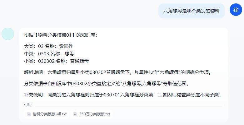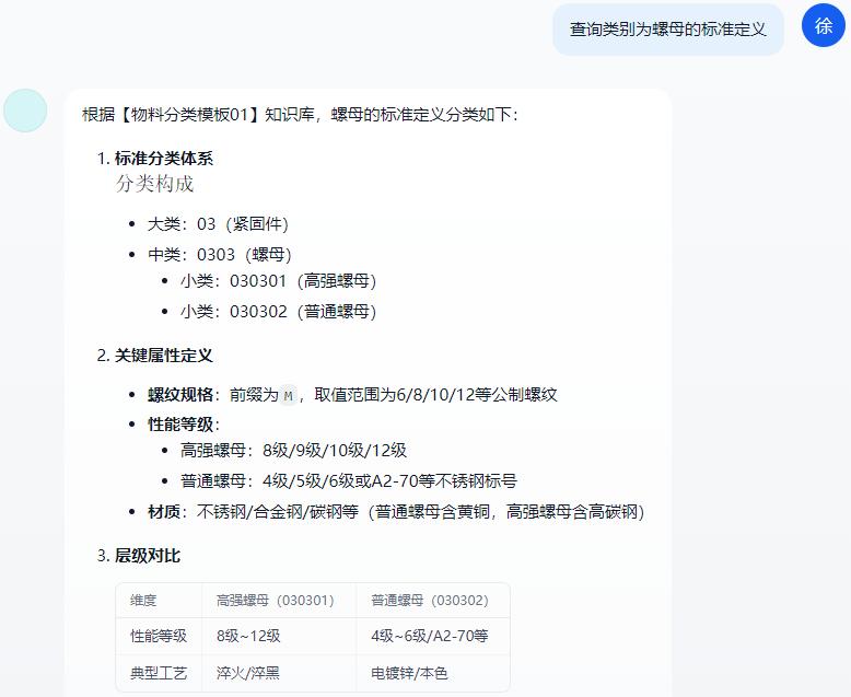 智能問答交互:用戶只需通過自然語言輸入問題(如“查詢類別為xxx的標(biāo)準(zhǔn)定義”、“根據(jù)物料長描述xxx推薦物料分類”),系統(tǒng)自動解析問題并精準(zhǔn)匹配知識庫中的物料標(biāo)準(zhǔn)信息,無需復(fù)雜操作。