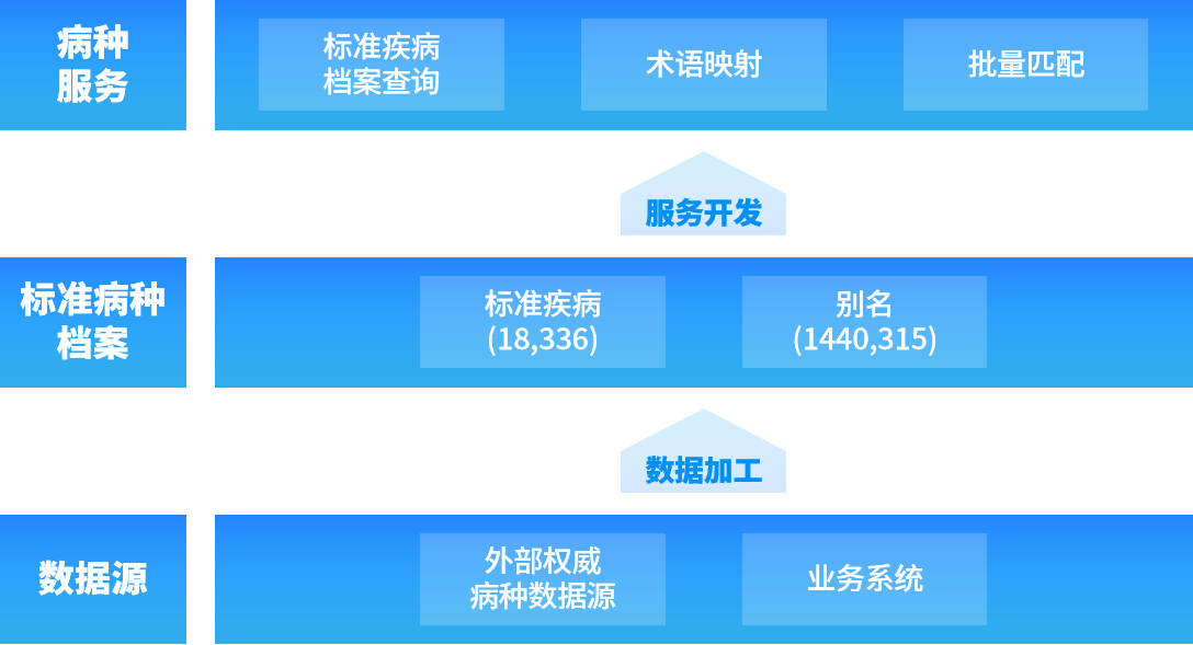 沒有統(tǒng)一標準的病種數(shù)據(jù),導(dǎo)致的核心問題主要為基于病種開展的相關(guān)數(shù)據(jù)分析復(fù)雜且不準確,分析人員需要將多種不規(guī)范的病種描述轉(zhuǎn)譯成統(tǒng)一名稱開展數(shù)據(jù)分析,從而導(dǎo)致分析工作的時間周期長及分析不準確的問題,因此疾病分類主數(shù)據(jù)建設(shè)的主要目標為建立標準的疾病分類檔案庫,并可提供便捷的匹配服務(wù),以便更好地支持基于病種進行用戶數(shù)據(jù)分析,以及后續(xù)開展病種知識庫建設(shè)形成病種知識庫建設(shè)的數(shù)據(jù)基礎(chǔ)。